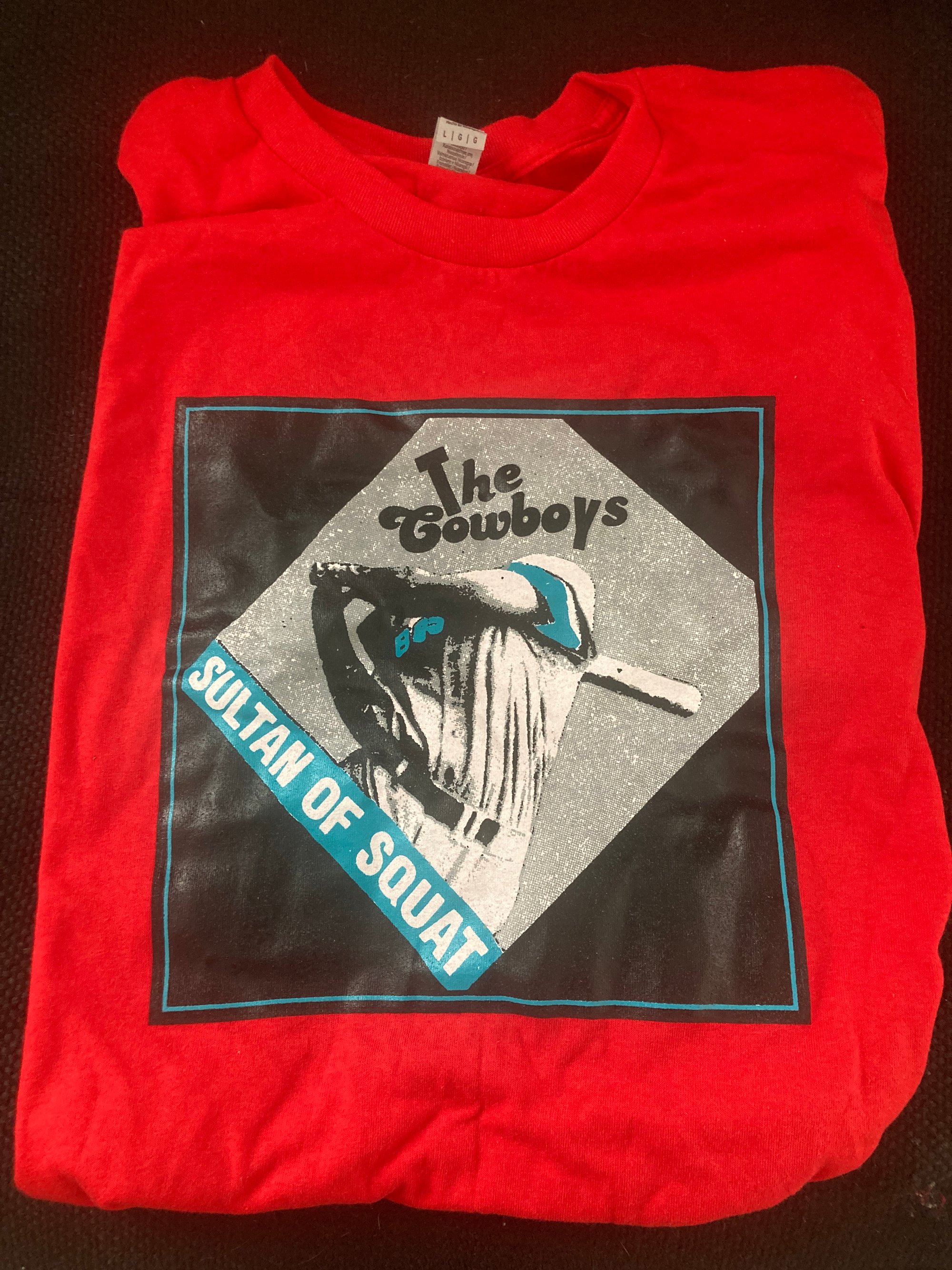 Screen print on Gildan heavy cotton. Sizes small, medium, large, and extra-large.
